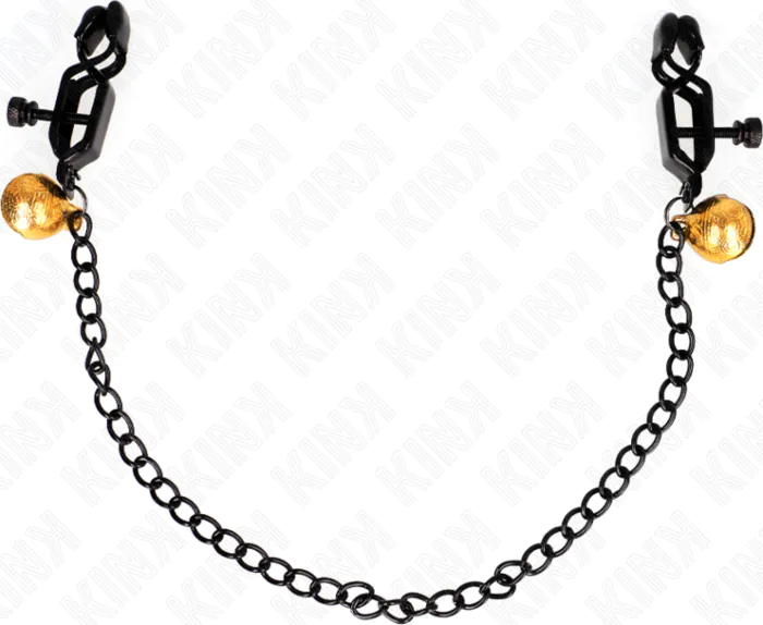 Oplev en ny dimension af nydelse med KINKs brystvorte klemmer, der kommer med en hængende kæde og klokker, som tilføjer et spændende auditivt og visuelt element. Fremstillet af holdbart metal, er disse klemmer designet til præcis kontrol og komfort under dine BDSM oplevelser.