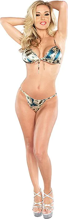 Legende to-dels sæt fra Exposed med grønne dollar print. Den ikke-bøjlede BH er lavet af et tyndt, figursyet stof og ties med sløjfer for justerbarhed, ledsaget af en matchende trusse.