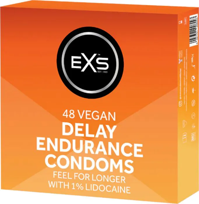 En pakke med 48 Exs Delay kondomer, der hjælper dig med at styre klimakset med et mildt desensibiliserende middel. De er lavet af naturlig latex og kommer for-lubriceret med et silikonebaseret gel.