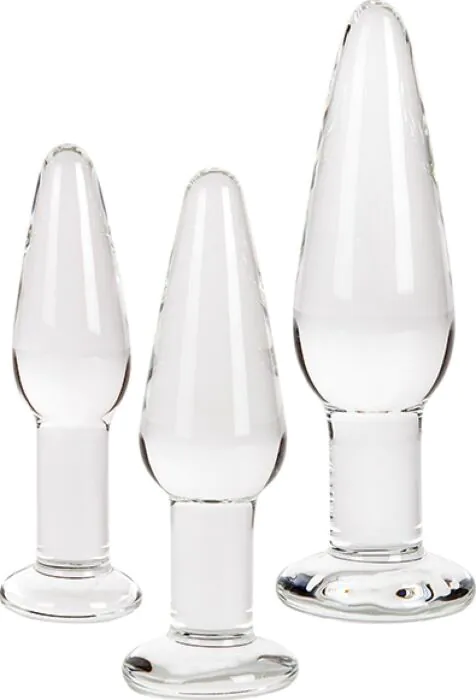 Denne pakke indeholder tre klare, stærke glas analpropper designet til gradvis træning. Hver prop har en skræddersyet profil og glat overflade, så du kan træne i dit eget tempo.