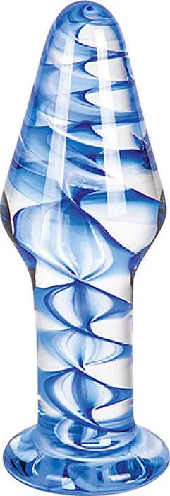 En slank, glat analprop i glas med et indvendigt blåt spiral mønster for visuel detalje og subtil indre tekstur. Optimal til kontrolleret og delikat stimulation.