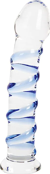 Dette er et præcisionsglasdildo lavet af højstyrke glas med klare og blå accenter. Den let buede skaft, spiralformede forhøjninger og den bredere spids formet som en glans tilbyder fokuseret, fast stimulation uanset om du bruger den vaginalt eller analt. Den flade bund giver et sikkert greb og kan bruges med seler, der accepterer en lille O-ring. En af de bedste egenskaber ved glas: du kan lege med temperatur for ekstra sansning.