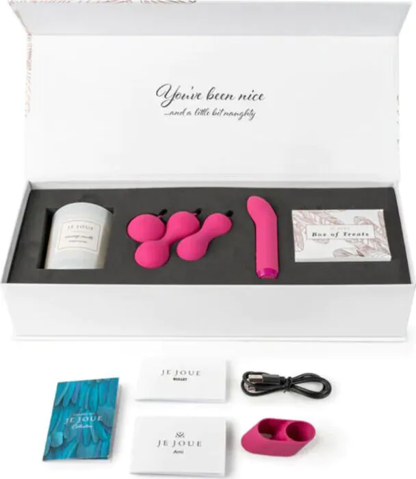 Denne begrænsede udgave af Je Joue gaveæske indeholder en lille G-punkt vibrator med fingerhylster, Ami 3-trins Kegel sæt, et jasmin & lilje massage lys og en Box of Treats. Præsenteret i elegant rose-guld emballage, passer den til par og nybegyndere, der ønsker et gennemtænkt og klar til brug sæt til intim velvære og bækkenbundstræning.