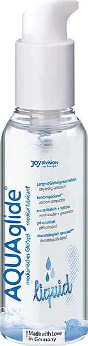 En meget flydende, hudvenlig glidecreme fra JOYDIVISION AQUAGLIDE i en 125 ml flaske. Designet til vaginal, anal og oral brug, den spreder sig let og føles mere våd end tykkere geler — god hvis du foretrækker en let, flydende tekstur.