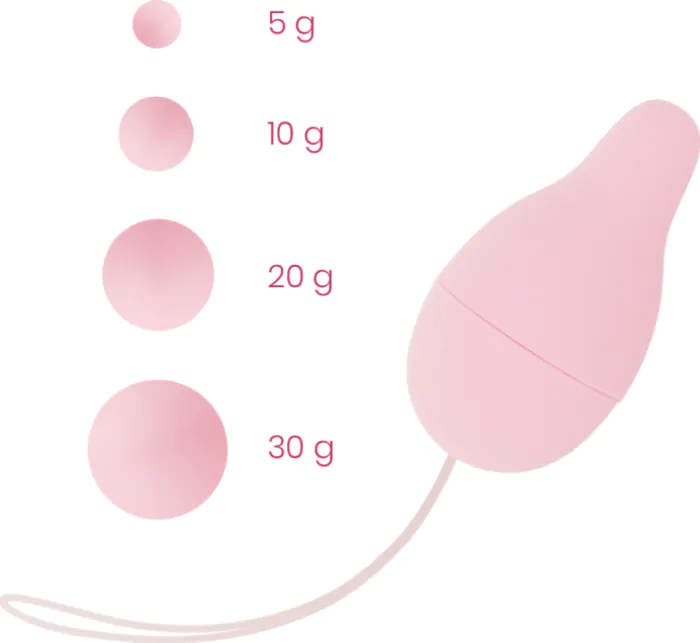 Med OHMAMA Kegel vægtsystemet kan du gradvist styrke din bækkenbund. Sættet består af fire forskellige vægte (5g, 10g, 20g, 30g), alle indkapslet i blød silikone for komfortabel indsættelse.