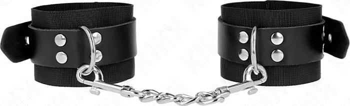 Oplev KINK's sorte nylon håndjern med justerbar læderrem, der giver komfort og sikkerhed. Disse håndjern passer til både nye og erfarne bondageentusiaster. Fremstillet af slidstærkt nylon, passer de til håndleds størrelser fra 19 cm til 29 cm, hvilket sikrer et tæt men behageligt greb.