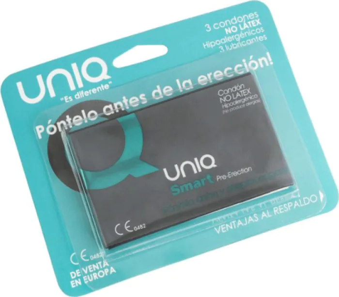 UNIQ Smart latexfrie for-erektion kondomer leveres i en praktisk pakke med tre stykker og glidecremesposer. De er ultratynde, gennemsigtige og hypoallergene, designet til at blive anbragt før ophidselse og bæres under forspil.