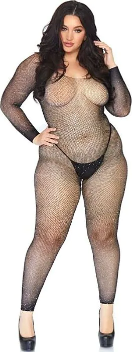 Til plus-size brugere, der søger en sømløs, strækbar fishnet bodystocking med glitrende detaljer.