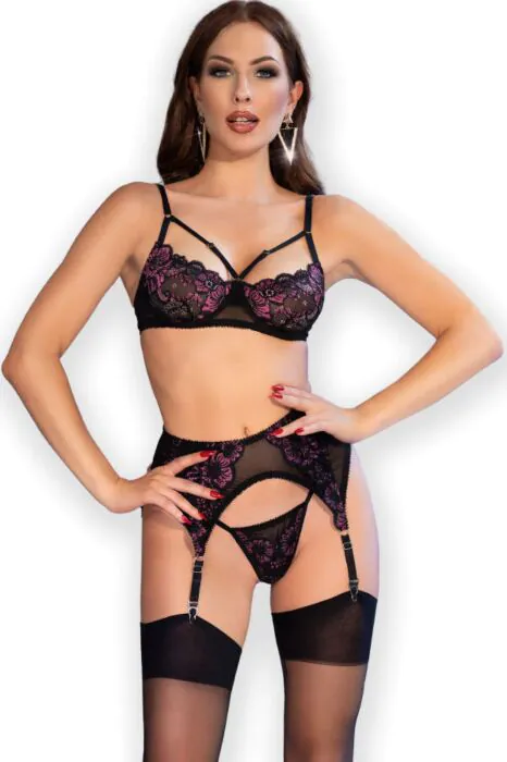 Med CHILIROSE CR 4693 lingeri sæt får du en kombination af stil og komfort. Fremstillet af et blødt, elastisk materiale, sikrer dette sæt bevægelsesfrihed og har et charmerende blonderdesign, der tilføjer elegance og lokkemad. De medfølgende dele sørger for, at du føler dig sensuel og selvsikker, hvad enten det er til en særlig anledning eller hverdagsbrug.