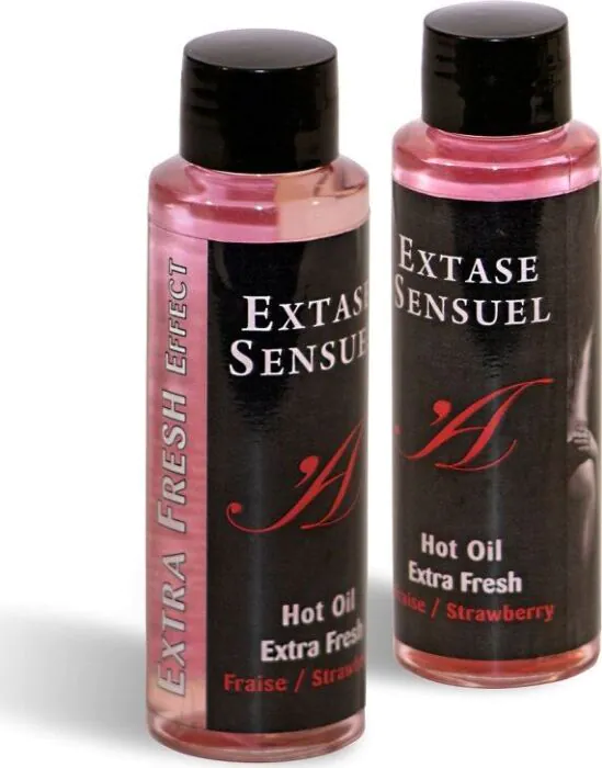Oplev en spændende dobbelt varmekold følelse med Extase Sensuals Ekstra Frisk Jordbær Massageolie. Praktisk til intime stunder, denne olie til ekstern brug nærer huden uden at efterlade pletter.