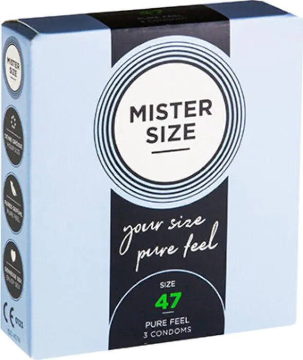 MISTER SIZE 47mm kondomer sikrer en tætsiddende pasform, der er designet til slanker peniser. Fremstillet af ultra-tynd naturgummi latex (0,05mm), disse kondomer giver en ren intensitet under intime øjeblikke.