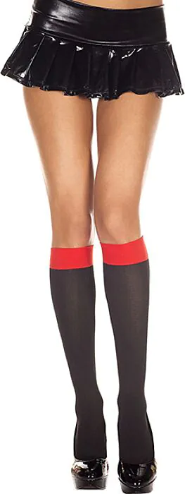 Denne glatte, uigennemsigtige strømpe fra Music Legs præsenteres i en to-farvet rød og sort finish. Den giver solid dækning frem for at være gennemsigtig, og stoffet har en flad, ikke-reflekterende overflade. Passer godt til dem, der ønsker en markant farvekombination og pålidelig opacitet — mere som et stilfuldt stykke end en delikat strømpe.