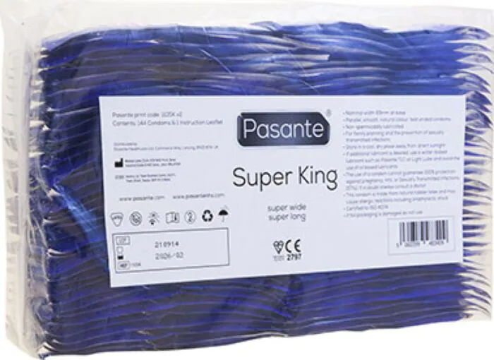Oplev ultimativ komfort med Pasante Super King XXL kondomer. Designet til dem, der behøver en bredere pasform, sikrer disse kondomer en sikker og behagelig oplevelse under intime stunder.