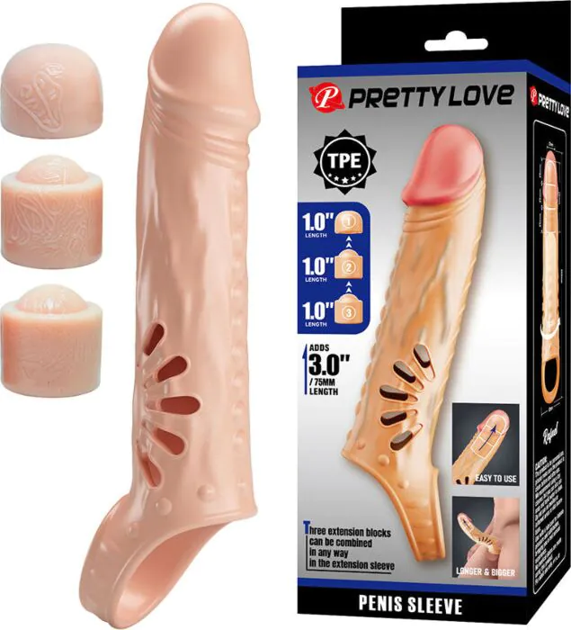 Forstærk din intimitet med Pretty Love Male penis hylster, lavet af blød og fleksibel premium TPE. Dette hylster giver mulighed for at tilpasse din oplevelse med tre aftagelige forlængelser, som tilføjer op til 7,5 cm i længde. Den livagtige design har udtalte teksturer og sideåbninger for at øge stimuleringen under penetration.
