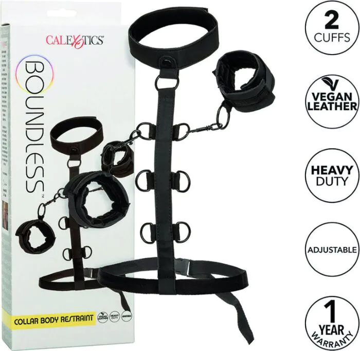 Oplev spændende bondage med CalExotics Boundless Collar. Dette alsidige restraintsystem med veganlæder manchetter er fremragende til både begyndere og entusiaster, der ønsker justerbare muligheder for intime eventyr sammen.