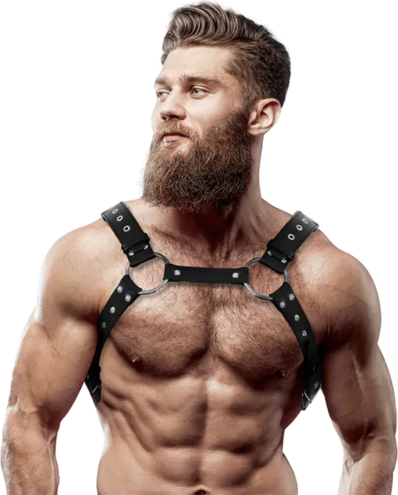 Fremhæv din stil med denne moderne sele i øko-læder, der fremhæver den mandlige kropsform. til dem, der ønsker at tilføje et dristigt element til deres outfit.