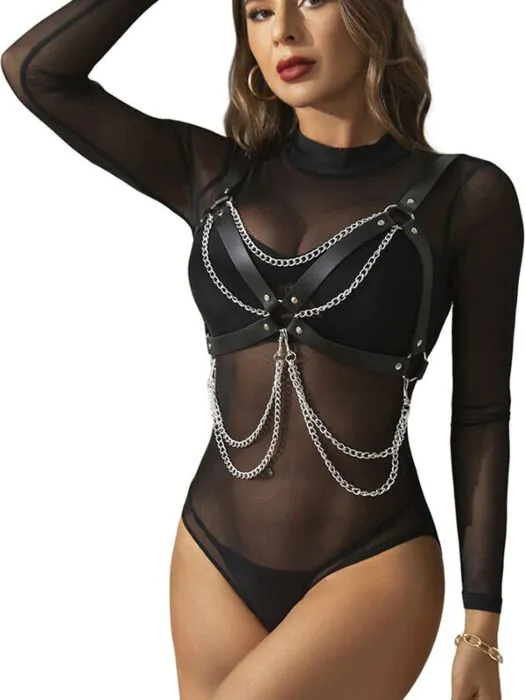Med denne eksklusive læder sele med kæder, der fremhæver dine kurver og øger din sensualitet. Den iøjnefaldende stjernes formede design giver en attraktiv æstetik, samtidig med at den sikrer komfort.