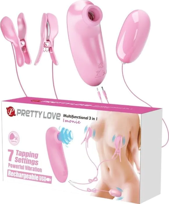 Oplev legesyg spænding med Pretty Love Imonie-sættet, der inkluderer brystvorte-klemmer med tappestimulator og en vibrerende bullet til tilpasset nydelse.