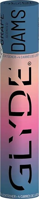 SHEER GLYDE oralsex dæmninger er silkebløde latexark (25×15 cm) med druesmag og kommer i en pakke med fire. De skaber en hygiejnisk barriere til oralkontakt med vulva eller anus og er lette at have med på farten.