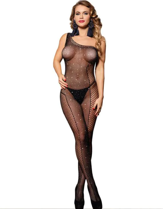Forvandl dit aftenlook med denne bodystocking med én skulder, som kombinerer moderne design med et strejf af luksus. Det sorte fiskenetmateriale, dekoreret med diamanter, giver både komfort og et fængslende udseende, der med sikkerhed vil vende hoveder.